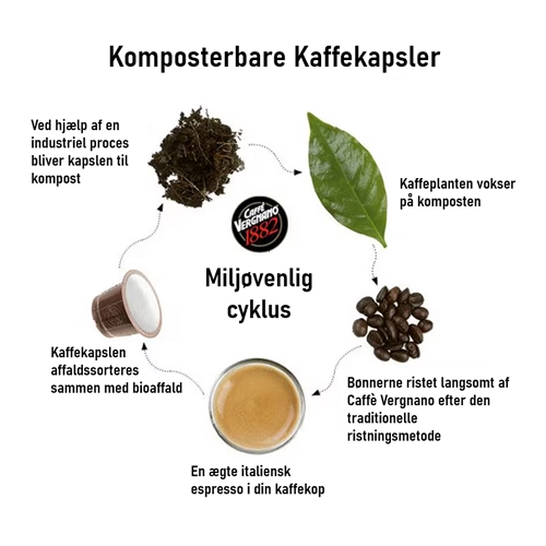 Kapslerne er fuldt komposterbare og kan bortskaffes i det organiske affald uden at tømme kaffeindholdet. Ved genanvendelse omdannes kapslerne til kompost, som bruges til at gøde jorden. Kapselomslaget er fremstillet af et biologisk nedbrydeligt polymer, der tåler høje temperaturer og tryk, og sikrer optimal ydeevne under kaffebrygningen. Ved at vælge Vergnano’s komposterbare kapsler får du en kaffeoplevelse, der er god i enhver forstand – både i smag og for miljøet.