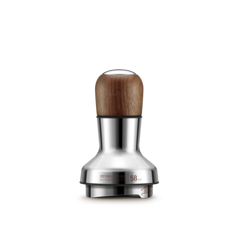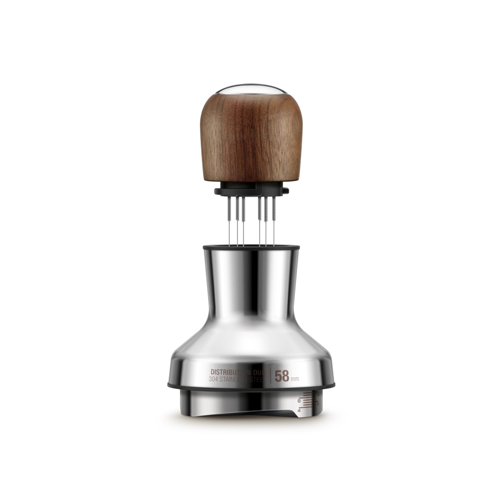 Værktøjet er lavet af rustfrit stål med detaljer i valnød, hvilket giver både holdbarhed og stil. Der er justerbar højde, og 8 aftagelige fordelingsstifter (kan bruges både lige eller vinklet) giver dig fleksibilitet til at tilpasse efter din dosering og højden i dit portafilter. Kompatibelt med Sage portafiltre på 58 mm.